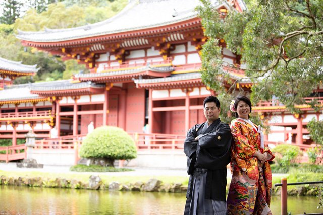 ハワイ在住日本人、日系人の方や国際結婚のカップルにも人気の和装婚。